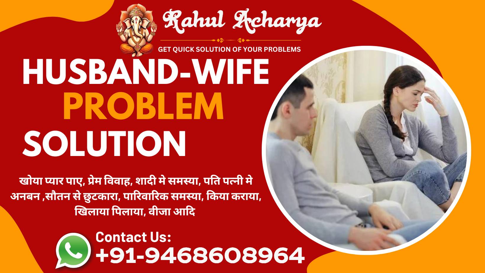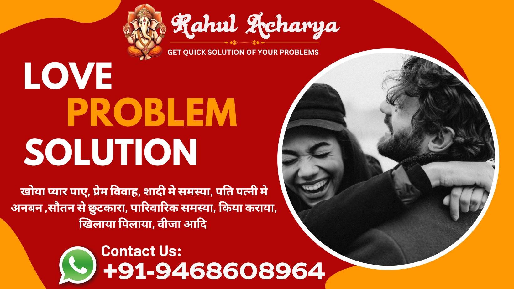 लव प्रॉब्लम, लव मैरिज प्रॉब्लम, रिलेशनशिप प्रॉब्लम। खोया हुआ प्यार वापस पाएं, प्रेमी समस्या, प्रेमिका समस्या, पति पत्नी विवाद रूठे प्रेमी को मनाना, पति पत्नी में अनबन, मनचाहा खोया प्यार पाएं, पारिवारिक समस्या, माता पिता को शादी के लिए राजी करना, सौतन से छुटकारा, गृह कलेश आदि सभी समस्याओं का समाधान घर बैठें पाएं। आपसे केवल एक कॉल दूर!